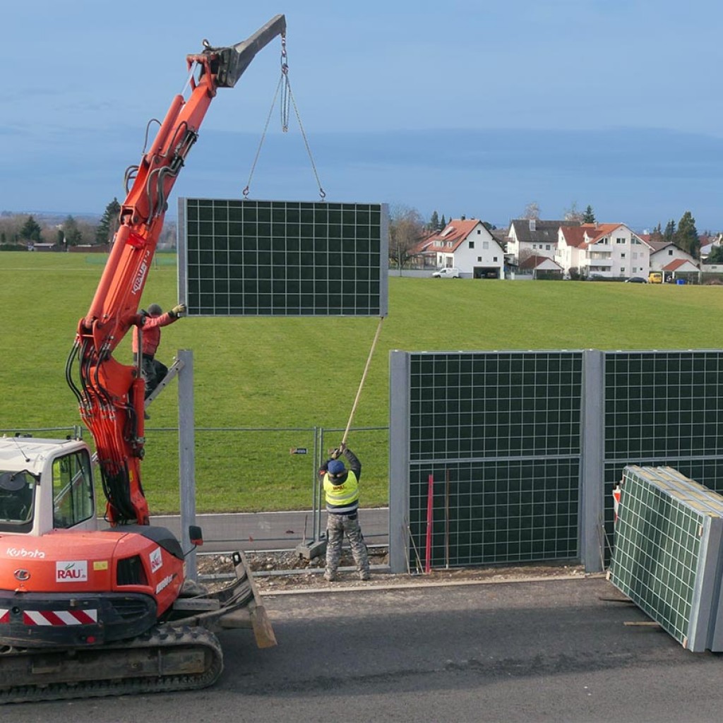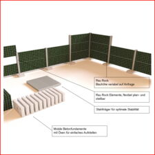 Mit dem System RAU ROCK Mobil haben Sie alle Vorteile auf Ihrer Seite. Auf mobilen Betonfundamenten werden in der Höhe variable Stahlträger verankert, in die die Lärmschutzmodule eingeschoben werden. Durch die speziellen, hocheffektiven Schichten der Lärmschutzwand RAU Rock wird eine hohe Schalldämmung erreicht. Das exklusiv für RAU produzierte unverrottbare und hochgradig UV-stabile Geotextil absorbiert den Schall zusätzlich mit einem Wirkungsgrad von 20 dB.