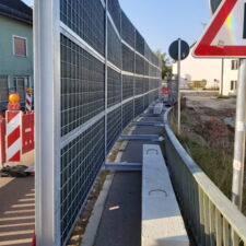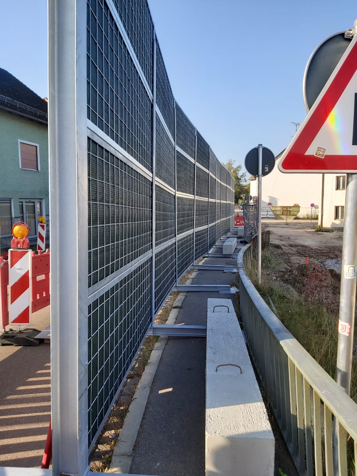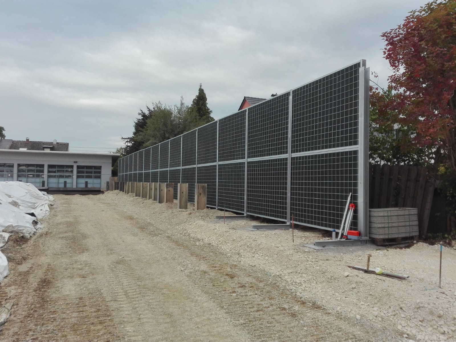 Die schlanke Lärmschutzwand hat eine Breite von nur 25 Zentimetern und kann mit fertig vormontierten Bauteilen variabel aufgebaut werden. Mobile Fundamente aus Betonblöcken und die robusten, vollverzinkten Stahlträger garantieren optimale Stabilität.