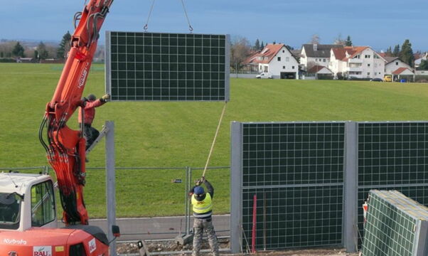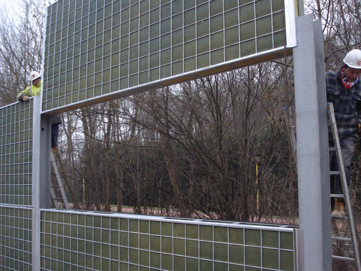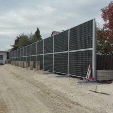 Die schlanke Lärmschutzwand hat eine Breite von nur 25 Zentimetern und kann mit fertig vormontierten Bauteilen variabel aufgebaut werden. Mobile Fundamente aus Betonblöcken und die robusten, vollverzinkten Stahlträger garantieren optimale Stabilität.