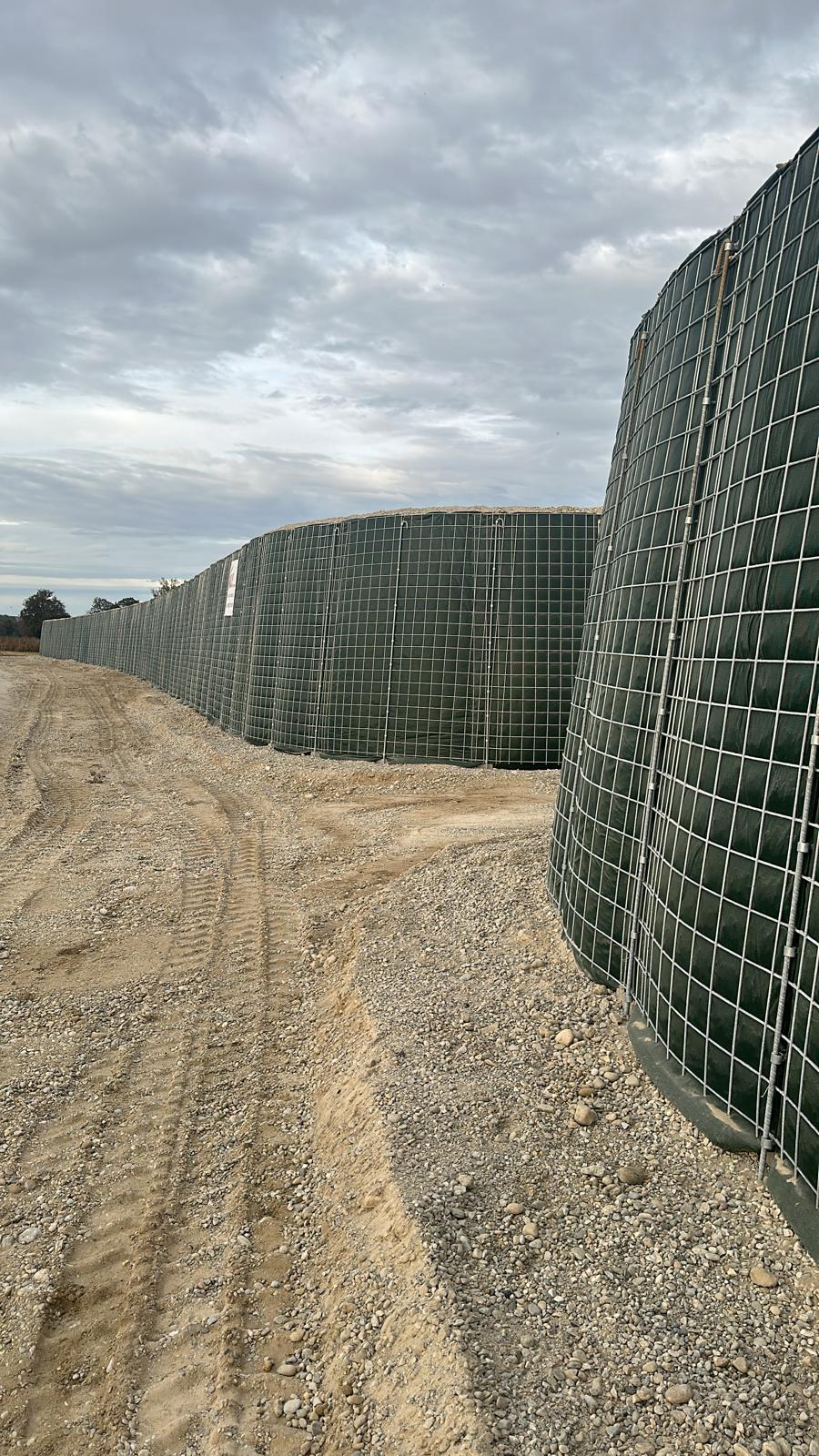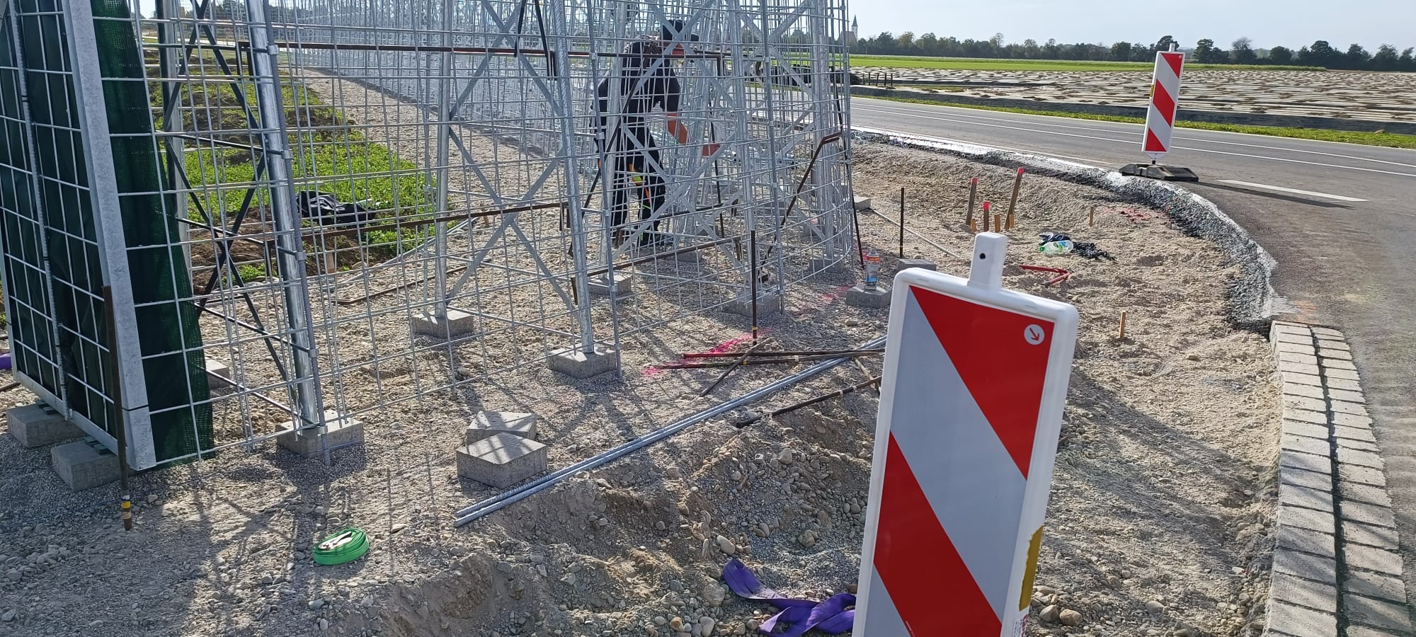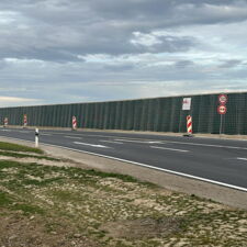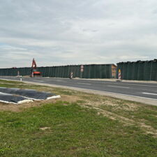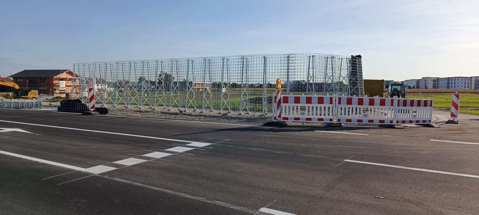 RAUbayern errichtet 204,15 m ökologischen Lärmschutz entlang des neuen Baugebietes in Mühldorf am Inn. An den zwei Durchlässen zum Wohngebiet und an Anfang und Ende wird die Lärmschutzwand in einem Viertelkreis gefertigt, um den seitlich auftreffenden Verkehrslärm effektiv abzuschirmen.